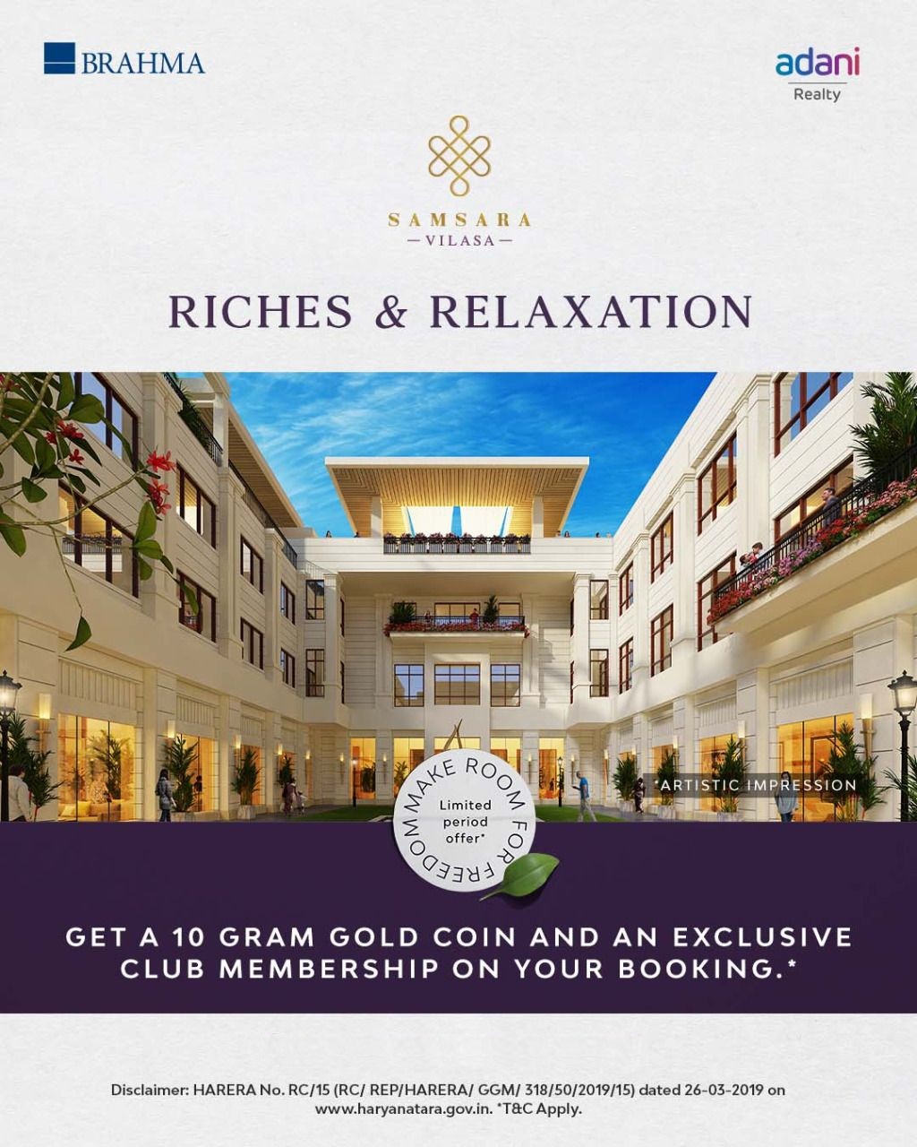Share Get a 10 gram gold coin and an exclusive club membership on your booking at Adani Samsara Vilasa, Gurgaon