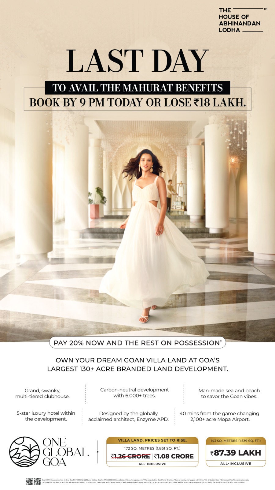 Share Last Day for Mahurat Benefits on One Global Goa by Abhinandan Lodha, Prices from ₹87.39 Lakh