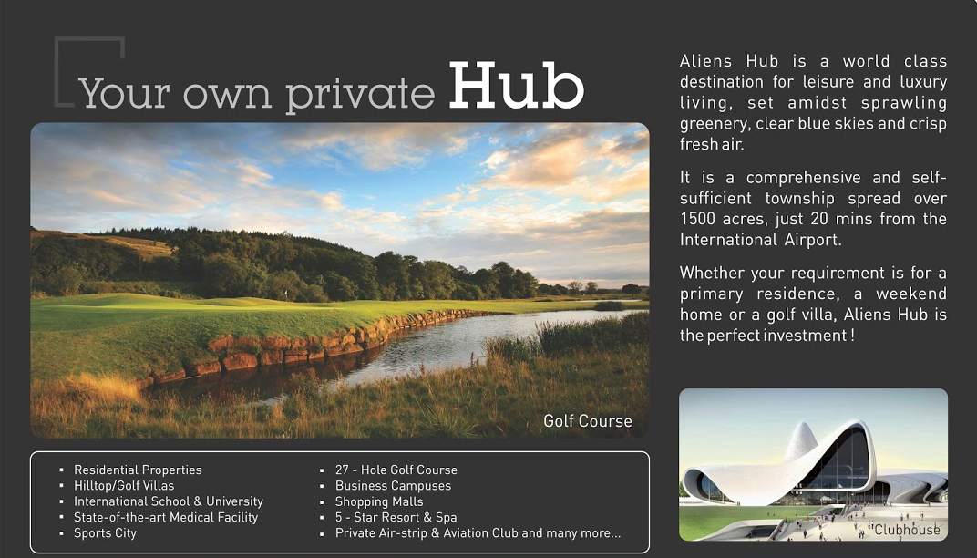 Aliens Hub is a world-class destination for leisure and luxury living, set amidst sprawling greenery, dear blue skies, and crisp fresh air. It is a comprehensive and self-sufficient township spread over 1500 acres, just 20 mins from the International Airport. Whether your requirement is for a primary residence, a weekend home or a golf villa, Aliens Hub is the perfect investment.