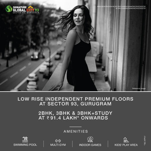 SIGNATURE GLOBAL CITY 93 nestled in the heart of New Gurugram, this project is strategically located at Sector 93, Gurugram, offering superior access to major roads – including NH 48, SPR, CPR & Dwarka Expressway. This is where you can assert your liberty in the independence of each spacious floor. The dynamic architectural language builds luxury, contemporary homes with modern amenities; in the prime and upcoming New Gurugram. All these converge to create cohesive community, where residents interact with each other under a soothingly lush green environment.