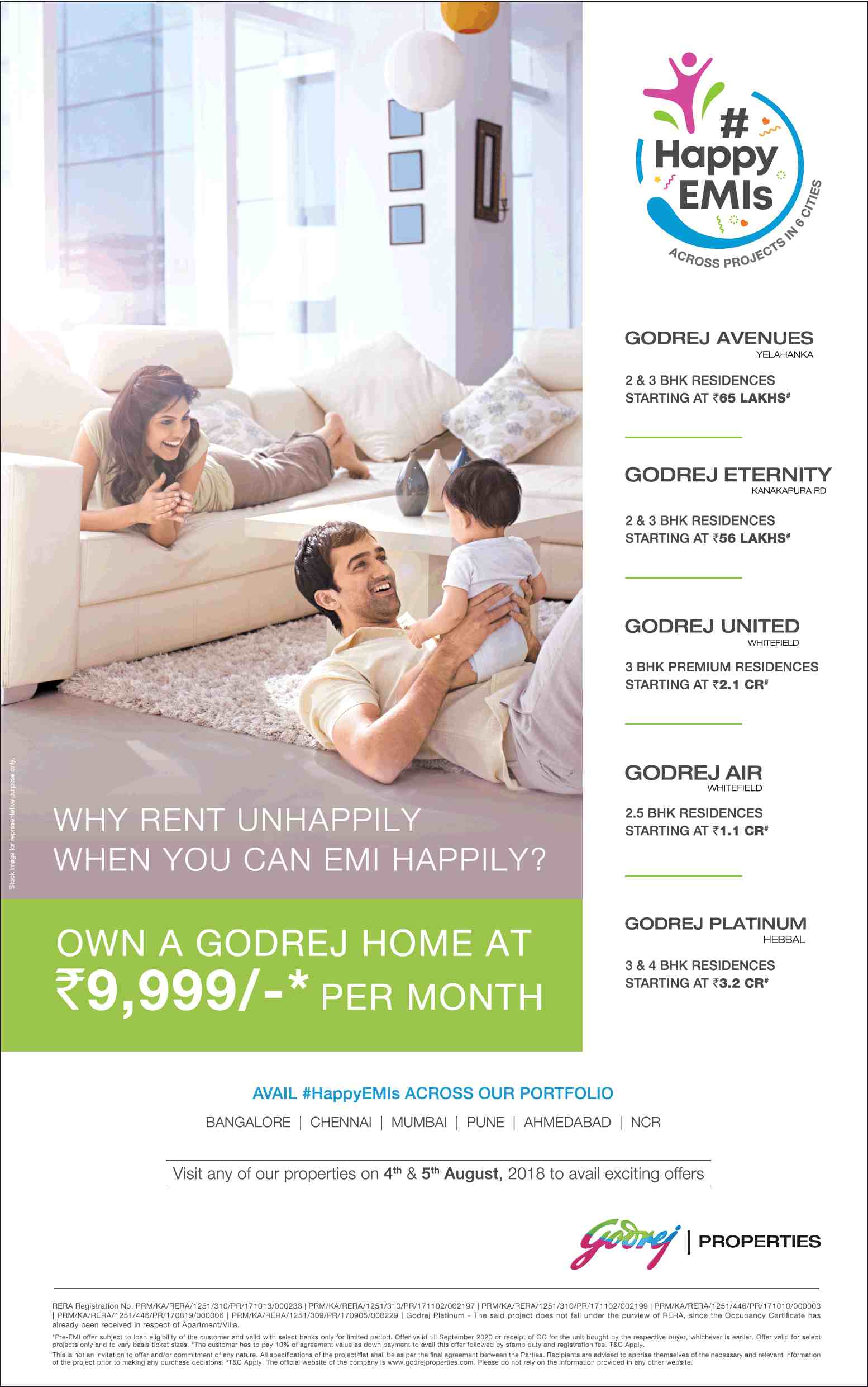 Presenting Godrej Happy EMIs Offer. Own a Godrej home at just Rs. 9,999 per month. So. book a Godrej home today, across select properties in Bangalore and bid farewell to the days of staying as a tenant.
