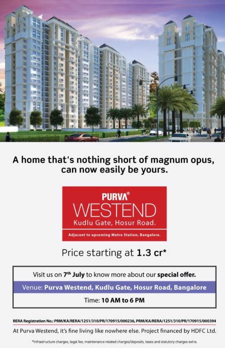 Purva Westend is a luxurious residential project developed by the Puravankara Projects Limited. The project is located in Hosur, Hosur Road, Bangalore. A home that's nothing short of magnum opus, can now easily be yours.