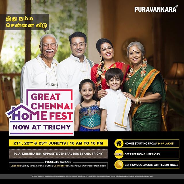 The Great Chennai Home Fest now at Trichy. Buy homes at never-before prices. Book your home with Puravankara and get an assured 8 gms Gold Coin, and free home interiors too. Join us on 21st, 22nd, and 23rd June, from 10 am to 10 pm, at PL. A. Krishna Inn, Opposite Central Bus Stand, Trichy.